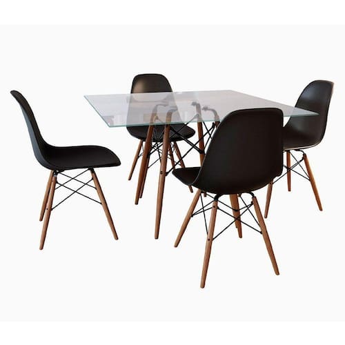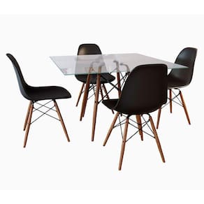 Conjunto Sala De Jantar Mesa Eames Eiffel Quadrada Vidro 90cm 4 Cadeiras PretasA Mesa Eiffel é a escolha ideal para deixar sua casa muito mais bonita e renovada. Essa mesa tem em sua estrutura materiais de altíssima qualidade, que proporciona muito mais resistência, mesmo com o passar dos anos. Ela tem formato quadrado e possui espaço para 4 lugares, o que é ideal para um jantar em família. A mesa é versátil e combina com vários tipos de decoração, o que dá mais praticidade em casa.Tipo: MesaModelo: EiffelCor: Tampo Quadrado PretoDimensões do Produto- Altura: 76cm- Largura: 90cm- Profundidade: 90cmCaracterísticas- Base: Ferro entrelaçado preto / branco / cobre- Tampo de Vidro / Madeira (mdp) com espessura de 25mm- Necessita Montagem? Parcialmente (Produto Entregue Montado Parcialmente)Conjunto Sala de Jantar Mesa Eames Eiffel Quadrada Vidro 90cm 4 Cadeiras Pretas