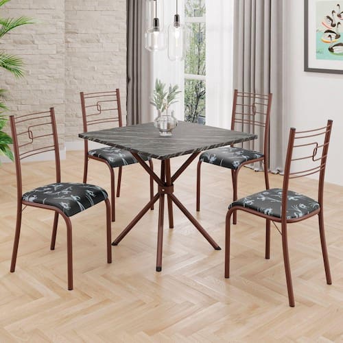 Conjunto Sala de Jantar Mesa Quadrada70x70cm Tampo Ardósia Indiana 4 Cadeiras Paraty Preto Floral / Marrom