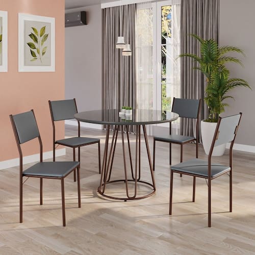 Este conjunto de mesa redonda e 4 cadeiras oferece estilo e praticidade. Com estrutura tubular em aço para estabilidade, o tampo em MDF Laca grafite com vidro adiciona sofisticação e resistência a riscos e manchas. As cadeiras combinam harmoniosamente com a mesa, garantindo conforto com estofamento. Ideal para diversos espaços, é perfeito para receber convidados ou desfrutar de refeições em família, criando um ambiente acolhedor e elegante.