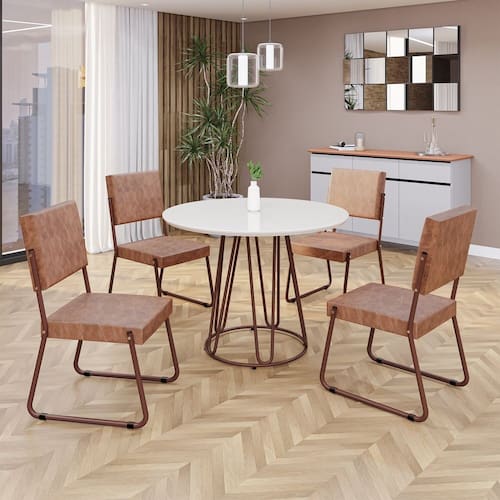 Este conjunto de mesa redonda e 4 cadeiras oferece estilo e praticidade. Com estrutura tubular em aço para estabilidade, o tampo em MDF Laca off white com vidro adiciona sofisticação e resistência a riscos e manchas. As cadeiras combinam harmoniosamente com a mesa, garantindo conforto com estofamento. Ideal para diversos espaços, é perfeito para receber convidados ou desfrutar de refeições em família, criando um ambiente acolhedor e elegante. Medida da Mesa (A x L x P): 77,5cm x 100cm x 100cm Peso da Mesa: 31 kg Mesa suporta até: 10 kg Acabamento da Cadeira/Banco: Pintura Texturizada Acabamento da Mesa: Laca Ambiente Principal: Sala de Jantar Cadeira/Banco estofada: Encosto e Assento Estofados Cadeira/Banco suporta até: 120 kg Complexidade da Montagem: Baixa: pode ser montado por uma pessoa sozinha Cor: Marrom Cor do Produto: Marrom Cor Secundária: Marrom De Canto (Canto Alemão): Não Enchimento do Assento: Espuma D-26 Escala de Brilho: Semi-Fosco Espessura do Tampo: 25 mm Estrutura do Assento: MDF, Eucalipto, espuma e Couro ecológico. Formato do Tampo: Redondo Itens Inclusos: 1 Mesa, 4 Cadeiras, Manual De Montagem E Ferragens. Linha ou Coleção: Napoli Manual de Montagem e Instalação: https://cdn2.madeiramadeira.com.br/atributo/moveis-teixeira/2171280-4938-17219323070172.pdf Material da Base da Mesa: Aço Material da Estrutura da Cadeira: Aço Material do Tampo: MDF/Vidro Medida da Cadeira/Banco (A x L x P): 94cm x 47,5cm x 59cm Medida do Tampo (L x C x E): 100cm x 100cm x 2,5cm Mesa Extensível: Não Necessita Montagem: Sim Origem do Produto: Nacional Peso da Cadeira/Banco: 7,06 kg Possui Apoio Para os Pés: Não Quantidade de Lugares: 04 Recomendações de Uso, Manutenção e Limpeza: Usar um pano de tecido macio e seco, evitar detergentes, alvejantes e produtos químicos de limpeza; no tampo usar tecido macio levemente umedecido. Revestimento da Cadeira/Banco: Couro Ecológico Sistema de Montagem: Parafusos