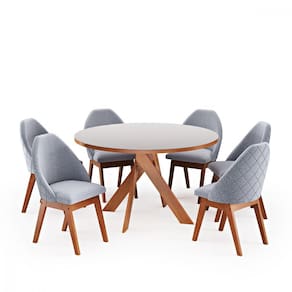 O conjunto de sala de jantar composto por uma mesa redonda de 137 cm e seis cadeiras Grécia da marca Madetal é uma opção sofisticada e funcional para quem busca conforto e elegância na decoração de sua sala de jantar.