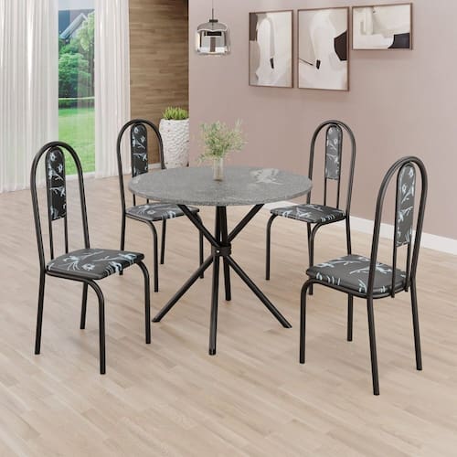 Este conjunto de mesa redonda e 4 cadeiras oferece estilo e praticidade. Com estrutura tubular em aço para estabilidade, o tampo em pedra granito adiciona sofisticação e resistência a riscos e manchas. As cadeiras combinam harmoniosamente com a mesa, garantindo conforto com estofamento. Ideal para diversos espaços, é perfeito para receber convidados ou desfrutar de refeições em família, criando um ambiente acolhedor e elegante. Medida da Mesa (A x L x P): 75,3 cm x 70 cm x 70 cm Peso da Mesa: 22.9 Mesa suporta até: 15 Acabamento da Cadeira/Banco: Pintura Texturizada Acabamento da Mesa: Pintura Texturizada Ambiente Principal: Sala de Jantar Cadeira/Banco estofada: Encosto e Assento Estofados Cadeira/Banco suporta até: 120 kg Complexidade da Montagem: Média: pode ser montado por mais de uma pessoa e/ou necessite de maior conhecimento para montagem Cor: Preto Floral/Preto Fosco Cor do Produto: Preto Floral/Preto Fosco Cor Secundária: Preto De Canto (Canto Alemão): Não Enchimento do Assento: Espuma D-12 Escala de Brilho: Semi-Fosco Espessura do Tampo: 18 Estrutura do Assento: MDP de 15mm, espuma 1,2mm, courino. Formato do Tampo: Redondo Itens Inclusos: 1 Mesa, 4 Cadeiras, Manual de Montagem e Ferragens. Manual de Montagem e Instalação: https://product-hub-prd.madeiramadeira.com.br/905621/documents/47d9af98-5a5b-4b08-8ac3-97138b8395221944063524617153659363761.pdf Material da Base da Mesa: Aço Material da Estrutura da Cadeira: Aço Material do Tampo: Granito Medida da Cadeira/Banco (A x L x P): 92X cm x 37,5X cm x 45,5X cm Medida do Tampo (L x C x E): 70 cm x 70 cm x 1,8 cm Mesa Extensível: Não Necessita Montagem: Sim Origem do Produto: Nacional Peso da Cadeira/Banco: 3,36 kg Possui Apoio Para os Pés: Não Quantidade de Lugares: 04 Recomendações de Uso, Manutenção e Limpeza: Usar um pano de tecido macio e seco, evitar detergentes, alvejantes e produtos químicos de limpeza; no tampo usar tecido macio levemente umedecido. Revestimento da Cadeira/Banco: Courino Sistema de Montagem: PARAFUSOS