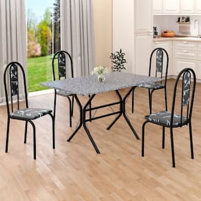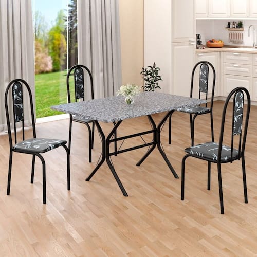 Este conjunto de mesa retangular e 4 cadeiras oferece estilo e praticidade. Com estrutura tubular em aço para estabilidade, o tampo em pedra granito adiciona sofisticação e resistência a riscos e manchas. As cadeiras combinam harmoniosamente com a mesa, garantindo conforto com estofamento. Ideal para diversos espaços, é perfeito para receber convidados ou desfrutar de refeições em família, criando um ambiente acolhedor e elegante. Medida da Mesa (A x L x P): 75,8 cm x 100 cm x 60 cm Peso da Mesa: 38.2 Mesa suporta até: 15 Acabamento da Cadeira/Banco: Pintura Texturizada Acabamento da Mesa: Polido Ambiente Principal: Sala de Jantar Cadeira/Banco estofada: Encosto e Assento Estofados Cadeira/Banco suporta até: 120 Complexidade da Montagem: Média: pode ser montado por mais de uma pessoa e/ou necessite de maior conhecimento para montagem Cor: Preto Floral/Preto Fosco Cor do Produto: Preto Floral/Preto Fosco Cor Secundária: Preto De Canto (Canto Alemão): Não Enchimento do Assento: Espuma D-12 Escala de Brilho: Semi-Fosco Espessura do Tampo: 18 Estrutura do Assento: MDP de 15mm, espuma 1,2mm, courino. Formato do Tampo: Retangular Itens Inclusos: 1 Mesa, 4 Cadeiras, Manual de Montagem e Ferragens. Manual de Montagem e Instalação: https://product-hub-prd.madeiramadeira.com.br/905712/documents/d805aaba-de48-4b2f-bed8-4fe0be1fa4941939656524617152793251776.pdf Material da Base da Mesa: Aço Material da Estrutura da Cadeira: Aço Material do Tampo: Granito Medida da Cadeira/Banco (A x L x P): 92X cm x 37,5X cm x 45,5X cm Medida do Tampo (L x C x E): 60 cm x 100 cm x 1,8 cm Mesa Extensível: Não Necessita Montagem: Sim Origem do Produto: Nacional Peso da Cadeira/Banco: 3.36 Possui Apoio Para os Pés: Não Quantidade de Lugares: 04 Recomendações de Uso, Manutenção e Limpeza: Usar um pano de tecido macio e seco, evitar detergentes, alvejantes e produtos químicos de limpeza; no tampo usar tecido macio levemente umedecido. Revestimento da Cadeira/Banco: Courino Sistema de Montagem: PARAFUSOS