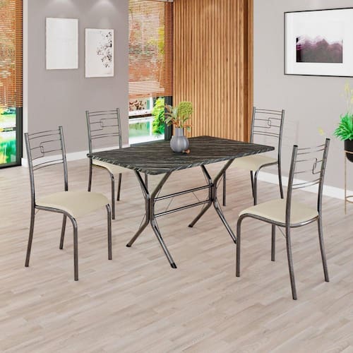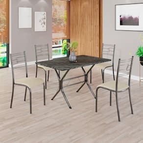 O Conjunto Sala de Jantar Paraty é uma ótima escolha para quem busca combinar estilo e praticidade. Este conjunto apresenta uma mesa retangular com um design elegante e moderno, acompanhada por quatro cadeiras. A mesa tem uma estrutura em aço, que oferece estabilidade ao conjunto. O tampo em pedra ardósia indiana apresenta uma estética sofisticada e acolhedora. A tonalidade indiana adiciona calor e elegância ao ambiente, enquanto a pedra ardósia oferece durabilidade e resistência a riscos e manchas. Essa combinação de cores naturais e resistência prática resulta em um visual clássico e funcional, tornando o tampo em pedra ardósia indiana uma ótima escolha para aprimorar sua sala de jantar. Medida da Mesa (A x L x P): 75,8 cm x 100 cm x 60 cm Peso da Mesa: 32,32 kg Mesa suporta até: 15.0000 Acabamento da Cadeira/Banco: Pintura Texturizada Acabamento da Mesa: Pintura Texturizada Ambiente Principal: Sala de Jantar Cadeira/Banco estofada: Somente Assento Estofado Cadeira/Banco Estofada: Somente Assento Estofado Cadeira/Banco suporta até: 120.0000 codigo_ean: 7909903586730 Complexidade da Montagem: Média: pode ser montado por mais de uma pessoa e/ou necessite de maior conhecimento para montagem Cor: Creme / Mart Prata Cor do Produto: Creme / Mart Prata De Canto (Canto Alemão): Não Escala de Brilho: Semi-Fosco Espessura do Tampo: 18 mm Formato do Tampo: Retangular Itens Inclusos: 1 mesa, 4 cadeiras, manual de montagem e ferragens. Manual de Montagem e Instalação: https://product-hub-prd.madeiramadeira.com.br/893404/documents/17e58814-2ed2-4d63-81f2-500de8e6538e800365cjparatybasecabofrio.pdf Material da Base da Mesa: Aço Material da Estrutura da Cadeira: Aço Material do Tampo: Ardósia Medida da Cadeira/Banco (A x L x P): 90 cm x 36,4 cm x 46 cm Medida do Tampo (L x C x E): 60 cm x 100 cm x 1,8 cm Mesa Extensível: Não Necessita Montagem: Sim Origem do Produto: Nacional Peso da Cadeira/Banco: 2,38 kg Possui Apoio Para os Pés: Não Quantidade de Cadeiras: 4 Quantidade de Lugares: 04 Recomendações de Uso, Manutenção e Limpeza: Usar um pano de tecido macio e seco, evitar detergentes, alvejantes e produtos químicos de limpeza; no tampo usar tecido macio levemente umedecido. Sistema de Montagem: PARAFUSOS