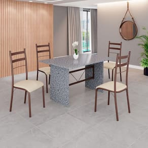O Conjunto Sala de Jantar Marselha é uma ótima escolha para quem busca combinar estilo e praticidade. Este conjunto apresenta uma mesa retangular com um design elegante e moderno, acompanhada por quatro cadeiras. A mesa tem uma estrutura em Granito Ocre, que oferece estabilidade ao conjunto. O tampo em pedra granito ocre apresenta uma estética sofisticada e acolhedora. A tonalidade ocre adiciona calor e elegância ao ambiente, enquanto a pedra granito oferece durabilidade e resistência a riscos e manchas. Essa combinação de cores naturais e resistência prática resulta em um visual clássico e funcional, tornando o tampo em pedra granito ocre uma ótima escolha para aprimorar sua sala de jantar. Medida da Mesa (A x L x P): 76,8 cm x 120 cm x 75 cm Peso da Mesa: 82,04 kg Mesa suporta até: 15.0000 Acabamento da Cadeira/Banco: Pintura Texturizada Acabamento da Mesa: Polido Ambiente Principal: Sala de Jantar Cadeira/Banco Estofada: Somente Assento Estofado Cadeira/Banco estofada: Somente Assento Estofado Cadeira/Banco suporta até: 120.0000 codigo_ean: 7909903553022 Complexidade da Montagem: Média: pode ser montado por mais de uma pessoa e/ou necessite de maior conhecimento para montagem Cor: Creme / Marrom Cor do Produto: Creme / Marrom De Canto (Canto Alemão): Não Escala de Brilho: Semi-Fosco Espessura do Tampo: 18 mm Formato do Tampo: Retangular Itens Inclusos: 1 Mesa, 4 Cadeiras, Kit Ferragens e Manual de Montagem Linha ou Coleção: Marselha Manual de Montagem e Instalação: https://product-hub-prd.madeiramadeira.com.br/890976/documents/1706fe17-519c-42bb-96c5-c7bc0aa7b56311cjmarselhabasegranito120.pdf Material da Base da Mesa: Granito Material da Estrutura da Cadeira: Aço Material do Tampo: Granito Medida da Cadeira/Banco (A x L x P): 100 cm x 36 cm x 52 cm Medida do Tampo (L x C x E): 75 cm x 120 cm x 1,8 cm Mesa Extensível: Não Necessita Montagem: Sim Origem do Produto: Nacional Peso da Cadeira/Banco: 2,94 kg Possui Apoio Para os Pés: Não Quantidade de Cadeiras: 4 Quantidade de Lugares: 04 Recomendações de Uso, Manutenção e Limpeza: Pano levemente umedecido e pano seco. Não utilizar produtos de limpeza Sistema de Montagem: PARAFUSOS