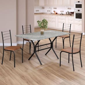 O Conjunto Sala de Jantar Rio é uma ótima escolha para quem busca combinar estilo e praticidade. Este conjunto apresenta uma mesa Retangular com um design elegante e moderno, acompanhada por quatro cadeiras. A mesa tem uma estrutura em aço, que oferece estabilidade ao conjunto. O tampo em pedra granito topázio apresenta uma estética sofisticada e acolhedora. A tonalidade topázio adiciona calor e elegância ao ambiente, enquanto a pedra granito oferece durabilidade e resistência a riscos e manchas. Essa combinação de cores naturais e resistência prática resulta em um visual clássico e funcional, tornando o tampo em pedra granito topázio uma ótima escolha para aprimorar sua sala de jantar. Medida da Mesa (A x L x P): 75,8 cm x 120 cm x 75 cm Peso da Mesa: 52,7 kg Mesa suporta até: 15 kg Acabamento da Cadeira/Banco: Pintura Texturizada Acabamento da Mesa: Pintura Texturizada Ambiente Principal: Sala de Jantar Cadeira/Banco estofada: Somente Assento Estofado Cadeira/Banco suporta até: 120 kg Complexidade da Montagem: Média: pode ser montado por mais de uma pessoa e/ou necessite de maior conhecimento para montagem Cor: C. Marrom / Preto Fosco Cor do Produto: C. Marrom / Preto Fosco Cor Secundária: Marrom De Canto (Canto Alemão): Não Escala de Brilho: Semi-Fosco Espessura do Tampo: 18 mm Estrutura do Assento: MDP de 15mm, espuma 1,2mm, courino. Formato do Tampo: Retangular Itens Inclusos: 1 Mesa, 4 Cadeiras, Manual de Montagem e Ferragens Manual de Montagem e Instalação: https://product-hub-prd.madeiramadeira.com.br/897895/documents/20e46b1d-ca4b-41f5-93c4-50cc50bc3dd51837585cjriocabofrio.pdf Material da Base da Mesa: Aço Material da Estrutura da Cadeira: Aço Material do Tampo: Granito Medida da Base (A x L x P): 74 cm x 65cm x 85,5 cm Medida da Cadeira/Banco (A x L x P): 84,5 cm x 37,5 cm x 41,5 cm Medida do Tampo (L x C x E): 75 cm x 120 cm x 1,8 cm Mesa Extensível: Não Necessita Montagem: Sim Origem do Produto: Nacional Peso da Cadeira/Banco: 2,48 kg Possui Apoio Para os Pés: Não Quantidade de Lugares: 04 Recomendações de Uso, Manutenção e Limpeza: Limpe a superfície usando um pano úmido com a solução(75%água + 15%detergente neutro), torça para retirar o excesso e, em seguida, finalize com um pano limpo e seco. Sistema de Montagem: Parafusos