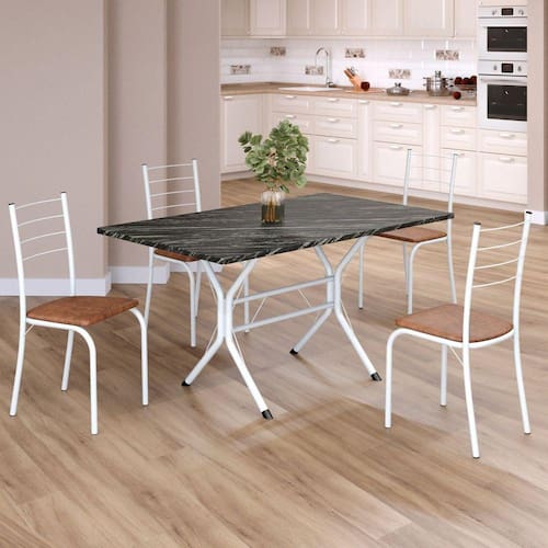 O Conjunto Sala de Jantar Rio é uma ótima escolha para quem busca combinar estilo e praticidade. Este conjunto apresenta uma mesa Retangular com um design elegante e moderno, acompanhada por quatro cadeiras. A mesa tem uma estrutura em aço, que oferece estabilidade ao conjunto. O tampo em Madeira MDP indiana apresenta uma estética sofisticada e acolhedora. A tonalidade indiana adiciona calor e elegância ao ambiente, enquanto a Madeira MDP oferece durabilidade e resistência a riscos e manchas. Essa combinação de cores naturais e resistência prática resulta em um visual clássico e funcional, tornando o tampo em madeira MDP indiana uma ótima escolha para aprimorar sua sala de jantar. Medida da Mesa (A x L x P): 75,8 cm x 120 cm x 75 cm Peso da Mesa: 11,25 kg Mesa suporta até: 15 kg Acabamento da Cadeira/Banco: Pintura Texturizada Acabamento da Mesa: Pintura Texturizada Ambiente Principal: Sala de Jantar Cadeira/Banco estofada: Somente Assento Estofado Cadeira/Banco suporta até: 120 kg Complexidade da Montagem: Média: pode ser montado por mais de uma pessoa e/ou necessite de maior conhecimento para montagem Cor: C. Marrom / Branco Cor do Produto: C. Marrom / Branco Cor Secundária: Marrom De Canto (Canto Alemão): Não Escala de Brilho: Semi-Fosco Espessura do Tampo: 15 mm Estrutura do Assento: MDP de 15mm, espuma 1,2mm, courino. Formato do Tampo: Retangular Itens Inclusos: 1 Mesa, 4 Cadeiras, Manual de Montagem e Ferragens Manual de Montagem e Instalação: https://product-hub-prd.madeiramadeira.com.br/897995/documents/a6354757-253e-40f3-af12-bc88173ef11e1837585cjriocabofrio.pdf Material da Base da Mesa: Aço Material da Estrutura da Cadeira: Aço Material do Tampo: MDP Medida da Base (A x L x P): 74 cm x 65cm x 85,5 cm Medida da Cadeira/Banco (A x L x P): 84,5 cm x 37,5 cm x 41,5 cm Medida do Tampo (L x C x E): 75 cm x 120 cm x 1,5 cm Mesa Extensível: Não Necessita Montagem: Sim Origem do Produto: Nacional Peso da Cadeira/Banco: 2,48 kg Possui Apoio Para os Pés: Não Quantidade de Lugares: 04 Recomendações de Uso, Manutenção e Limpeza: Limpe a superfície usando um pano úmido com a solução(75%água + 15%detergente neutro), torça para retirar o excesso e, em seguida, finalize com um pano limpo e seco. Sistema de Montagem: Parafusos