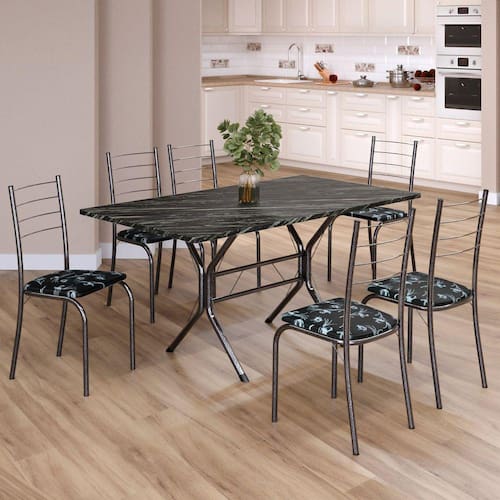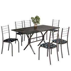 Conjunto Sala de Jantar Mesa Retangular 140x75cm Tampo Ardósia Indiana 6 Cadeiras Rio Preto Floral / Mart Prata