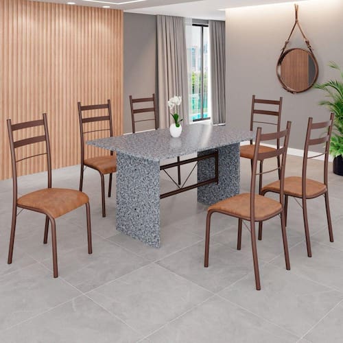 O Conjunto Sala de Jantar Marselha é uma ótima escolha para quem busca combinar estilo e praticidade. Este conjunto apresenta uma mesa retangular com um design elegante e moderno, acompanhada por seis cadeiras. A mesa tem uma estrutura em Granito Ocre, que oferece estabilidade ao conjunto. O tampo em pedra granito ocre apresenta uma estética sofisticada e acolhedora. A tonalidade ocre adiciona calor e elegância ao ambiente, enquanto a pedra granito oferece durabilidade e resistência a riscos e manchas. Essa combinação de cores naturais e resistência prática resulta em um visual clássico e funcional, tornando o tampo em pedra granito ocre uma ótima escolha para aprimorar sua sala de jantar. Medida da Mesa (A x L x P): 76,8 cm x 140 cm x 75 cm Peso da Mesa: 90,58 kg Mesa suporta até: 15.0000 Acabamento da Cadeira/Banco: Pintura Texturizada Acabamento da Mesa: Polido Ambiente Principal: Sala de Jantar Cadeira/Banco Estofada: Somente Assento Estofado Cadeira/Banco estofada: Somente Assento Estofado Cadeira/Banco suporta até: 120.0000 codigo_ean: 7909903553367 Complexidade da Montagem: Média: pode ser montado por mais de uma pessoa e/ou necessite de maior conhecimento para montagem Cor: C. Marrom / Marrom Cor do Produto: C. Marrom / Marrom De Canto (Canto Alemão): Não Escala de Brilho: Semi-Fosco Espessura do Tampo: 18 mm Formato do Tampo: Retangular Itens Inclusos: 1 Mesa, 4 Cadeiras, Kit Ferragens e Manual de Montagem Linha ou Coleção: Marselha Manual de Montagem e Instalação: https://product-hub-prd.madeiramadeira.com.br/891074/documents/cb8332dd-9692-469b-9256-b3fd251f89d087cjmarselhabasegranito140.pdf Material da Base da Mesa: Granito Material da Estrutura da Cadeira: Aço Material do Tampo: Granito Medida da Base (A x L x P): 75 cm x 40 cm x 94,10 cm Medida da Cadeira/Banco (A x L x P): 100 cm x 36 cm x 52 cm Medida do Tampo (L x C x E): 75 cm x 140 cm x 1,8 cm Mesa Extensível: Não Necessita Montagem: Sim Origem do Produto: Nacional Peso da Cadeira/Banco: 2,94 kg Possui Apoio Para os Pés: Não Quantidade de Cadeiras: 6 Quantidade de Lugares: 06 Recomendações de Uso, Manutenção e Limpeza: Pano levemente umedecido e pano seco. Não utilizar produtos de limpeza Sistema de Montagem: PARAFUSOS