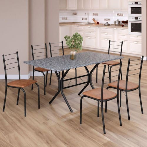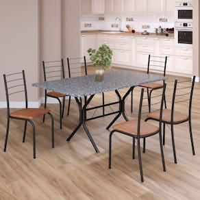 O Conjunto Sala de Jantar Rio é uma ótima escolha para quem busca combinar estilo e praticidade. Este conjunto apresenta uma mesa Retangular com um design elegante e moderno, acompanhada por seis cadeiras. A mesa tem uma estrutura em aço, que oferece estabilidade ao conjunto. O tampo em pedra granito ocre apresenta uma estética sofisticada e acolhedora. A tonalidade ocre adiciona calor e elegância ao ambiente, enquanto a pedra granito oferece durabilidade e resistência a riscos e manchas. Essa combinação de cores naturais e resistência prática resulta em um visual clássico e funcional, tornando o tampo em pedra granito ocre uma ótima escolha para aprimorar sua sala de jantar. Medida da Mesa (A x L x P): 75,8 cm x 140 cm x 75 cm Peso da Mesa: 62,3 kg Mesa suporta até: 15 kg Acabamento da Cadeira/Banco: Pintura Texturizada Acabamento da Mesa: Pintura Texturizada Ambiente Principal: Sala de Jantar Cadeira/Banco estofada: Somente Assento Estofado Cadeira/Banco suporta até: 120 kg Complexidade da Montagem: Média: pode ser montado por mais de uma pessoa e/ou necessite de maior conhecimento para montagem Cor: C. Marrom / Preto Fosco Cor do Produto: C. Marrom / Preto Fosco Cor Secundária: Marrom De Canto (Canto Alemão): Não Escala de Brilho: Semi-Fosco Espessura do Tampo: 18 mm Estrutura do Assento: MDP de 15mm, espuma 1,2mm, courino. Formato do Tampo: Retangular Itens Inclusos: 1 Mesa, 6 Cadeiras, Manual de Montagem e Ferragens Manual de Montagem e Instalação: https://product-hub-prd.madeiramadeira.com.br/897528/documents/904e668c-11b5-4cb3-ae54-0cb931ba6f911837585cjriocabofrio.pdf Material da Base da Mesa: Aço Material da Estrutura da Cadeira: Aço Material do Tampo: Granito Medida da Base (A x L x P): 75,5cm x 65cm x 85,5 cm Medida da Cadeira/Banco (A x L x P): 84,5 cm x 37,5 cm x 41,5 cm Medida do Tampo (L x C x E): 140 cm x 75 cm x 1,8 cm Mesa Extensível: Não Necessita Montagem: Sim Origem do Produto: Nacional Peso da Cadeira/Banco: 2,48 kg Possui Apoio Para os Pés: Não Quantidade de Lugares: 06 Recomendações de Uso, Manutenção e Limpeza: Limpe a superfície usando um pano úmido com a solução(75%água + 15%detergente neutro), torça para retirar o excesso e, em seguida, finalize com um pano limpo e seco. Sistema de Montagem: Parafusos