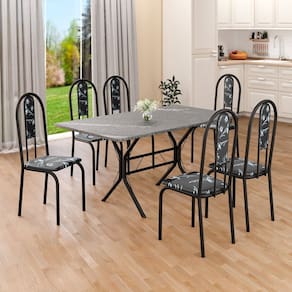 Este conjunto de mesa retangular e 6 cadeiras oferece estilo e praticidade. Com estrutura tubular em aço para estabilidade, o tampo em pedra granito adiciona sofisticação e resistência a riscos e manchas. As cadeiras combinam harmoniosamente com a mesa, garantindo conforto com estofamento. Ideal para diversos espaços, é perfeito para receber convidados ou desfrutar de refeições em família, criando um ambiente acolhedor e elegante. Medida da Mesa (A x L x P): 75,8 cm x 140 cm x 75 cm Peso da Mesa: 57.1 Mesa suporta até: 15 Acabamento da Cadeira/Banco: Pintura Texturizada Acabamento da Mesa: Polido Ambiente Principal: Sala de Jantar Cadeira/Banco estofada: Encosto e Assento Estofados Cadeira/Banco suporta até: 120 kg Complexidade da Montagem: Média: pode ser montado por mais de uma pessoa e/ou necessite de maior conhecimento para montagem Cor: Preto Floral/Preto Fosco Cor do Produto: Preto Floral/Preto Fosco Cor Secundária: Preto De Canto (Canto Alemão): Não Enchimento do Assento: Espuma D-12 Escala de Brilho: Semi-Fosco Espessura do Tampo: 18 Estrutura do Assento: MDP de 15mm, espuma 1,2mm, courino. Formato do Tampo: Retangular Itens Inclusos: 1 Mesa, 6 Cadeiras, Manual de Montagem e Ferragens. Manual de Montagem e Instalação: https://product-hub-prd.madeiramadeira.com.br/905470/documents/4780165c-562b-40cd-a6f0-95447e66dc881943642524617153612240957.pdf Material da Base da Mesa: Aço Material da Estrutura da Cadeira: Aço Material do Tampo: Granito Medida da Cadeira/Banco (A x L x P): 92X cm x 37,5X cm x 45,5X cm Medida do Tampo (L x C x E): 75 cm x 140 cm x 1,8 cm Mesa Extensível: Não Necessita Montagem: Sim Origem do Produto: Nacional Peso da Cadeira/Banco: 3,36 kg Possui Apoio Para os Pés: Não Quantidade de Lugares: 06 Recomendações de Uso, Manutenção e Limpeza: Usar um pano de tecido macio e seco, evitar detergentes, alvejantes e produtos químicos de limpeza; no tampo usar tecido macio levemente umedecido. Revestimento da Cadeira/Banco: Courino Sistema de Montagem: PARAFUSOS