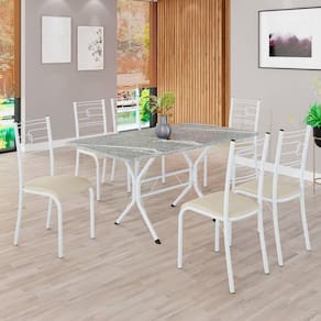 Conjunto Sala de Jantar Mesa Retangular 140x75cm Tampo Granito Topázio 6 Cadeiras Paraty Creme / Branco