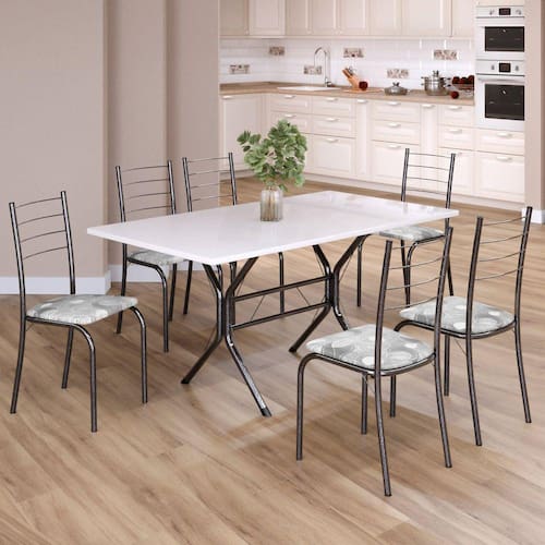 O Conjunto Sala de Jantar Rio é uma ótima escolha para quem busca combinar estilo e praticidade. Este conjunto apresenta uma mesa Retangular com um design elegante e moderno, acompanhada por seis cadeiras. A mesa tem uma estrutura em aço, que oferece estabilidade ao conjunto. O tampo em Madeira MDP Off White apresenta uma estética sofisticada e acolhedora. A tonalidade Off White adiciona calor e elegância ao ambiente, enquanto a Madeira MDP oferece durabilidade e resistência a riscos e manchas. Essa combinação de cores naturais e resistência prática resulta em um visual clássico e funcional, tornando o tampo em madeira MDP off white uma ótima escolha para aprimorar sua sala de jantar. Medida da Mesa (A x L x P): 75,8 cm x 140 cm x 75 cm Peso da Mesa: 12,52 kg Mesa suporta até: 15 kg Acabamento da Cadeira/Banco: Pintura Texturizada Acabamento da Mesa: Pintura Texturizada Ambiente Principal: Sala de Jantar Cadeira/Banco estofada: Somente Assento Estofado Cadeira/Banco suporta até: 120 kg Complexidade da Montagem: Média: pode ser montado por mais de uma pessoa e/ou necessite de maior conhecimento para montagem Cor: Paraopeba / Mart Prata Cor do Produto: Paraopeba / Mart Prata Cor Secundária: Cinza De Canto (Canto Alemão): Não Escala de Brilho: Semi-Fosco Espessura do Tampo: 15 mm Estrutura do Assento: MDP de 15mm, espuma 1,2mm, courino. Formato do Tampo: Retangular Itens Inclusos: 1 Mesa, 6 Cadeiras, Manual de Montagem e Ferragens Manual de Montagem e Instalação: https://product-hub-prd.madeiramadeira.com.br/897772/documents/e16b625c-3568-4b5c-ac30-b63cf2c433371837585cjriocabofrio.pdf Material da Base da Mesa: Aço Material da Estrutura da Cadeira: Aço Material do Tampo: MDP Medida da Base (A x L x P): 74 cm x 58,9 cm x 90 cm Medida da Cadeira/Banco (A x L x P): 84,5 cm x 37,5 cm x 41,5 cm Medida do Tampo (L x C x E): 75 cm x 140 cm x 1,5 cm Mesa Extensível: Não Necessita Montagem: Sim Origem do Produto: Nacional Peso da Cadeira/Banco: 2,48 kg Possui Apoio Para os Pés: Não Quantidade de Lugares: 06 Recomendações de Uso, Manutenção e Limpeza: Limpe a superfície usando um pano úmido com a solução(75%água + 15%detergente neutro), torça para retirar o excesso e, em seguida, finalize com um pano limpo e seco. Sistema de Montagem: Parafusos