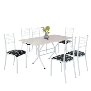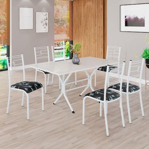Conjunto Sala de Jantar Mesa Retangular 140x75cm Tampo Madeira Mdp Off White 6 Cadeiras Paraty Preto Floral / Branco
