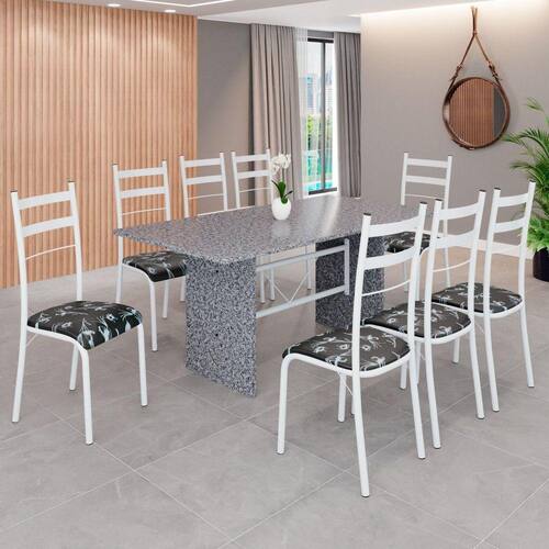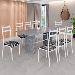 O Conjunto Sala de Jantar Marselha é uma ótima escolha para quem busca combinar estilo e praticidade. Este conjunto apresenta uma mesa retangular com um design elegante e moderno, acompanhada por oito cadeiras. A mesa tem uma estrutura em Granito Ocre, que oferece estabilidade ao conjunto. O tampo em pedra granito ocre apresenta uma estética sofisticada e acolhedora. A tonalidade ocre adiciona calor e elegância ao ambiente, enquanto a pedra granito oferece durabilidade e resistência a riscos e manchas. Essa combinação de cores naturais e resistência prática resulta em um visual clássico e funcional, tornando o tampo em pedra granito ocre uma ótima escolha para aprimorar sua sala de jantar. Medida da Mesa (A x L x P): 76,8 cm x 180 cm x 75 cm Peso da Mesa: 112,22 kg Mesa suporta até: 15.0000 Acabamento da Cadeira/Banco: Pintura Texturizada Acabamento da Mesa: Polido Ambiente Principal: Sala de Jantar Cadeira/Banco estofada: Somente Assento Estofado Cadeira/Banco Estofada: Somente Assento Estofado Cadeira/Banco suporta até: 120.0000 codigo_ean: 7909903555217 Complexidade da Montagem: Média: pode ser montado por mais de uma pessoa e/ou necessite de maior conhecimento para montagem Cor: Preto Floral / Branco Cor do Produto: Preto Floral / Branco De Canto (Canto Alemão): Não Escala de Brilho: Semi-Fosco Espessura do Tampo: 18 mm Formato do Tampo: Retangular Itens Inclusos: 1 Mesa, 4 Cadeiras, Kit Ferragens e Manual de Montagem Linha ou Coleção: Marselha Manual de Montagem e Instalação: https://product-hub-prd.madeiramadeira.com.br/891211/documents/7c113e90-06c3-41d7-95dd-496e22f66ccb24cjmarselhabasegranito180.pdf Material da Base da Mesa: Granito Material da Estrutura da Cadeira: Aço Material do Tampo: Granito Medida da Cadeira/Banco (A x L x P): 100 cm x 36 cm x 52 cm Medida do Tampo (L x C x E): 75 cm x 180 cm x 1,8 cm Mesa Extensível: Não Necessita Montagem: Sim Origem do Produto: Nacional Peso da Cadeira/Banco: 2,94 kg Possui Apoio Para os Pés: Não Quantidade de Cadeiras: 8 Quantidade de Lugares: 08 Recomendações de Uso, Manutenção e Limpeza: Pano levemente umedecido e pano seco. Não utilizar produtos de limpeza Sistema de Montagem: PARAFUSOS