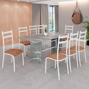 O Conjunto Sala de Jantar Marselha é uma ótima escolha para quem busca combinar estilo e praticidade. Este conjunto apresenta uma mesa retangular com um design elegante e moderno, acompanhada por oito cadeiras. A mesa tem uma estrutura em Granito Topázio, que oferece estabilidade ao conjunto. O tampo em pedra granito topázio apresenta uma estética sofisticada e acolhedora. A tonalidade topázio adiciona calor e elegância ao ambiente, enquanto a pedra granito oferece durabilidade e resistência a riscos e manchas. Essa combinação de cores naturais e resistência prática resulta em um visual clássico e funcional, tornando o tampo em pedra granito topázio uma ótima escolha para aprimorar sua sala de jantar. Medida da Mesa (A x L x P): 76,8 cm x 180 cm x 75 cm Peso da Mesa: 109,22 kg Mesa suporta até: 15.0000 Acabamento da Cadeira/Banco: Pintura Texturizada Acabamento da Mesa: Polido Ambiente Principal: Sala de Jantar Cadeira/Banco estofada: Somente Assento Estofado Cadeira/Banco Estofada: Somente Assento Estofado Cadeira/Banco suporta até: 120.0000 codigo_ean: 7909903559215 Complexidade da Montagem: Média: pode ser montado por mais de uma pessoa e/ou necessite de maior conhecimento para montagem Cor: C. Marrom / Branco Cor do Produto: C. Marrom / Branco De Canto (Canto Alemão): Não Escala de Brilho: Semi-Fosco Espessura do Tampo: 18 mm Formato do Tampo: Retangular Itens Inclusos: 1 Mesa, 4 Cadeiras, Kit Ferragens e Manual de Montagem Linha ou Coleção: Marselha Manual de Montagem e Instalação: https://product-hub-prd.madeiramadeira.com.br/891334/documents/0ee602f5-2efe-4611-a42d-23888a6efa0b42cjmarselhabasegranito180.pdf Material da Base da Mesa: Granito Material da Estrutura da Cadeira: Aço Material do Tampo: Granito Medida da Cadeira/Banco (A x L x P): 100 cm x 36 cm x 52 cm Medida do Tampo (L x C x E): 75 cm x 180 cm x 1,8 cm Mesa Extensível: Não Necessita Montagem: Sim Origem do Produto: Nacional Peso da Cadeira/Banco: 2,94 kg Possui Apoio Para os Pés: Não Quantidade de Cadeiras: 8 Quantidade de Lugares: 08 Recomendações de Uso, Manutenção e Limpeza: Pano levemente umedecido e pano seco. Não utilizar produtos de limpeza Sistema de Montagem: PARAFUSOS