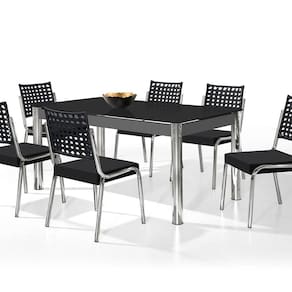 Conjunto com pés robusto de Aço Carbono CROMADO Polido de alto brilho, de design agradável. Mesa de design convencional, com travas de MDP-BP espessas, com sistemas de fixação que se encaixa perfeitamente e precisamente, a perfeita junção do aço com a madeira em uma mesa o vidro é serigrafado temperado para dar maior resistência e durabilidade. Cadeiras de design convencional e muito confortáveis, o diferencial estas em seu encosto com junco sintético com proteção U.V., o acabamento do trançado do junco da leveza e a transparência para o conjunto, assento reforçado em caixa, com revestimentos em suede, fixados com porcas garras. Produtos de montagem fácil e funcional. Medida da Mesa (A x L x P): 77x90x160 cm Peso da Mesa: 39,1 kg Mesa suporta até: 40.0000 Acabamento da Cadeira/Banco: Cromado Acabamento da Mesa: Cromado Acompanha Manual de Instalação: Sim Almofada do assento: Removível Altura do Conjunto: 90 cm Ambiente Principal: Sala de Jantar Cadeira/Banco Estofada: Somente Assento Estofado Cadeira/Banco estofada: Somente Assento Estofado Cadeira/Banco suporta até: 120.0000 codigo_ean: 7909903970799 Complexidade da Montagem: Baixa: pode ser montado por uma pessoa sozinha Cor: Cromado/Preto Cor do Produto: Cromado/Preto De Canto (Canto Alemão): Não Design da Base: 4 Pés Escala de Brilho: Brilhante Espessura do Tampo: 6 mm Espessura do Vidro: 6 mm Estrutura do Assento: MDF Formato do Tampo: Retangular Itens Inclusos: 1 Mesa, 6 Cadeiras, Kit Ferragens e Manual de Montagem Linha ou Coleção: NATANI Manual de Especificação Técnica: https://product-hub-prd.madeiramadeira.com.br/957977/documents/1cd8001d-1d7f-449f-981c-6aa460e73f582436095598517284803418545.pdf Manual de Montagem e Instalação: https://product-hub-prd.madeiramadeira.com.br/957977/documents/db7d3b44-86ce-4c97-bd4f-4495128a0a452436094598517284803389744.pdf Material da Base da Mesa: Aço Cromado Material da Estrutura da Cadeira: Aço Carbono Material do Tampo: Vidro Material Principal: Aço Carbono Cromado Material Principal das Cadeiras/Bancos: Aço Carbono Medida da Base (A x L x P): 76x88x158 cm Medida da Cadeira/Banco (A x L x P): 92x49x52 Medida do Tampo (L x C x E): 90x160x6 Mesa Dobrável: Não Mesa Extensível: Não Necessita Montagem: Sim Origem do Produto: Nacional Peso da Cadeira/Banco: 4,85 kg Possui Apoio para Braços: Não Possui Apoio Para os Pés: Não Possui Prateleiras: Não Possui Suporte Giratório: Não Possui Vidro: Sim Quantidade de Cadeiras: 6 Quantidade de Lugares: 06 Recomendações de Uso, Manutenção e Limpeza: Limpeza com pano macio e levemente umedecido. Não ultilizar solventes a base e de inflamáveis. Não utilizar produtos abrasivos. Sistema de Montagem: parafusos Tipo de Assento: Removível Tipo de Encosto: Solto Vidro Temperado: Sim
