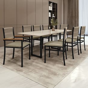 O Conjunto Mesa Itália com a Cadeira Barcelona é a combinação perfeita de estilo e funcionalidade para sua sala de jantar. A mesa retangular conta com tampo em MDF amadeirado e estrutura em aço com pintura epóxi, garantindo resistência e durabilidade. Acompanha 8 cadeiras confortáveis, com assento estofado em courino de fácil limpeza e encosto em tela sintética trançada. Duas cadeiras possuem braços em madeira, oferecendo ainda mais comodidade. Ideal para reunir a família e amigos em um ambiente elegante e acolhedor.