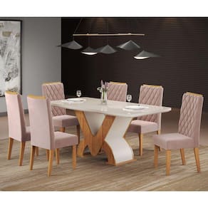 Mesas são indispensáveis para o funcionamento da casa e é no cômodo de confraternização que elas ganham protagonismo. Composto por peças de muito charme, o Conjunto Novita torna o uso desse móvel importante com 6 cadeiras para garantir uma usabilidade plena para o seu dia a dia Medida da Mesa (A x L x P): A:80 X L:180 x P:90xm Peso da Mesa: 61,9 kg Mesa suporta até: 50.0000 Acabamento da Cadeira/Banco: Pintura UV Acabamento da Mesa: Pintura UV Acompanha Manual de Instalação: Sim Almofada do encosto: Não Possui Altura do Conjunto: 98 cm Ambiente Principal: Sala de Jantar Cadeira/Banco estofada: Encosto e Assento Estofados Cadeira/Banco Estofada: Encosto e Assento Estofados Cadeira/Banco suporta até: 90.0000 codigo_ean: 7909903401415 Complexidade da Montagem: Média: pode ser montado por mais de uma pessoa e/ou necessite de maior conhecimento para montagem Cor: Mel/Off White/Rosa Cor do Produto: Mel/Off White/Rosa De Canto (Canto Alemão): Não Enchimento do Assento: Espuma D-20 Enchimento do Encosto: Espuma D-12 Escala de Brilho: Semi-Brilho Espessura do Tampo: 40 mm Estrutura do Assento: MDP/Espuma Estrutura do Encosto: MDP/Espuma Formato do Tampo: Retangular Itens Inclusos: 1 mesa, 6 cadeiras, kit ferragens e manual de montagem Manual de Montagem e Instalação: https://product-hub-prd.madeiramadeira.com.br/865846/documents/08f10f00-b4ea-413b-ad86-ec6f51c913d2gemsalanovitacomcadeiraiza.pdf Material da Base da Mesa: MDF/MDP Material da Estrutura da Cadeira: MDF/MDP Material do Tampo: MDF/Vidro Material Principal: MDF/MDP/Vidro/Tecido Material Principal das Cadeiras/Bancos: MDF/MDP Medida da Cadeira/Banco (A x L x P): A:98 x L:42 x P:48cm Medida do Tampo (L x C x E): 180x90x4cm Mesa Dobrável: Não Mesa Extensível: Não Necessita Montagem: Sim Origem do Produto: Nacional Peso da Cadeira/Banco: 8,25 kg Possui Apoio para Braços: Não Possui Apoio Para os Pés: Não Possui Prateleiras: Não Possui Suporte Giratório: Não Possui Vidro: Sim Quantidade de Cadeiras: 6 Quantidade de Lugares: 06 Recomendações de Uso, Manutenção e Limpeza: Limpar com pano levemente umedecido com água Revestimento da Cadeira/Banco: Veludo Sistema de Montagem: Parafusos e cavilhas Tipo de Assento: Fixo Tipo de Encosto: Estofado Ean: 7909903401415