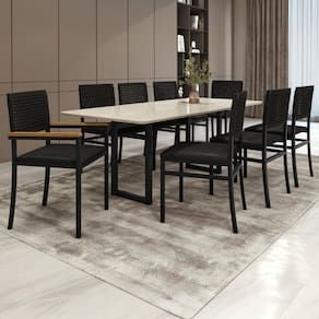 O Conjunto Mesa Itália com a Cadeira Madri é a combinação perfeita de estilo e funcionalidade para sua sala de jantar. A mesa retangular conta com tampo em MDF amadeirado e estrutura em aço com pintura epóxi, garantindo resistência e durabilidade. Acompanha 8 cadeiras confortáveis, com assento estofado em courino de fácil limpeza e encosto em tela sintética trançada. Duas cadeiras possuem braços em madeira, oferecendo ainda mais comodidade. Ideal para reunir a família e amigos em um ambiente elegante e acolhedor.