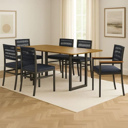 O Conjunto Mesa Itália com a Cadeira Barcelona é a combinação perfeita de estilo e funcionalidade para sua sala de jantar. A mesa retangular conta com tampo em MDF amadeirado e estrutura em aço com pintura epóxi, garantindo resistência e durabilidade. Acompanha 6 cadeiras confortáveis, com assento estofado em courino preto de fácil limpeza e encosto em tela sintética trançada. Duas cadeiras possuem braços em madeira, oferecendo ainda mais comodidade. Ideal para reunir a família e amigos em um ambiente elegante e acolhedor.