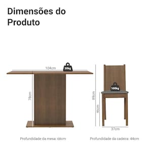 A mesa retangular acomoda até quatro pessoas. O tom amadeirado agrega beleza ao produto e combina com os mais variados ambientes. Muito práticas, as cadeiras são fabricadas em MDF e MDP, com encosto em pintura e assento estofado.