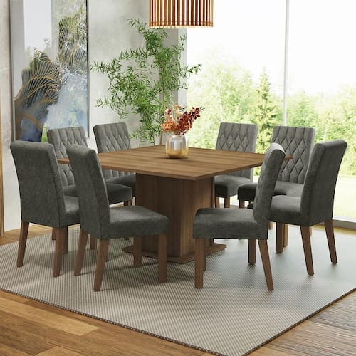 A mesa é espaçosa e comporta muito bem até oito pessoas. Possui base em pedestal e tampo retangular em MDP.