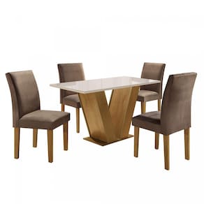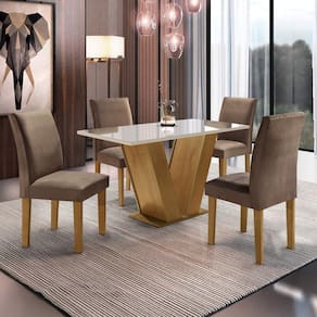Se você pretende completar a sua casa com bom gosto e charme, então veja que mimo este lindo Conjunto de Mesa e Cadeiras, Não é uma excelente forma de começar? Super charmoso, ele é perfeito para que você dê um visual fancy e moderno para o seu lar, Medida da Mesa (A x L x P): 79,5cm x 120cm x 80cm Peso da Mesa: 25 kg Mesa suporta até: 40 kg Acabamento da Cadeira/Banco: Pintura UV Acabamento da Mesa: Pintura UV Almofada do assento: Fixa Ambiente Principal: Sala de Jantar Cadeira/Banco estofada: Sim Cadeira/Banco Estofada: Encosto e Assento Estofados Cadeira/Banco suporta até: 120 kg Cadeira/Banco Suporta Até: 120 kg Complexidade da Montagem: Alta: deve ser montado por um montador especializado Cor: Ypê/Suede Marrom Cor do Produto: Ypê/Suede Marrom Cor Predominante: Marrom Cor Secundária: Branco De Canto (Canto Alemão): Não Design da Base: Em "V" Enchimento do Assento: Espuma D-23 Enchimento do Encosto: Espuma D-20 Escala de Brilho: Fosco Espessura do Tampo: 22 mm Estrutura do Assento: MDF Estrutura do Encosto: MDF Formato do Tampo: Retangular Itens Inclusos: 1 Mesa, 4 Cadeiras e Manual de Montagem, Linha ou Coleção: Espanha Manual de Especificação Técnica: https://cdn2,madeiramadeira,com,br/atributo/cel-m-veis/812729-534243-conjunto-espanha-4-cadeiras-vidro,pdf Manual de Montagem e Instalação: Material da Base da Mesa: MDF Material da Estrutura da Cadeira: MDF Material do Tampo: Vidro/MDF Material Principal das Cadeiras/Bancos: MDF Medida da Base (A x L x P): 77,3cm x 89cm x 40cm Medida da Cadeira/Banco (A x L x P): 95cm x 44cm x 56cm Medida do Tampo (L x C x E): 120cm x 90cm x 2,2cm Mesa Extensível: Não Necessita Montagem: Sim Origem do Produto: Nacional Peso da Cadeira/Banco: 7,5 kg Possui Apoio para Braços: Não Possui Apoio Para os Pés: Não Possui Suporte Giratório: Não Quantidade de Lugares: 04 Recomendações de Uso, Manutenção e Limpeza: Limpeza com pano macio e levemente umedecido, Não utilizar solventes a base e de inflamáveis, Não utilizar produtos abrasivos, Revestimento da Cadeira/Banco: Suede Sistema de Montagem: Parafusos e Minifix, Tamanho: undefined: Outro Vidro Temperado: Sim