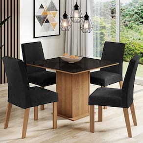 As cadeiras de jantar são fabricadas em MDF e MDP, com encosto e assento estofados com espuma de alta densidade e revestidos em tecido Suede Oxford, de toque macio e suave.