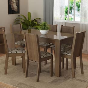 A mesa é retangular, com pés estruturais e acomoda perfeitamente até seis pessoas. O vidro incolor sobreposto ao tampo de madeira deixa o ambiente ainda mais elegante.