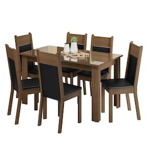 A mesa é retangular, com pés estruturais e acomoda perfeitamente até seis pessoas. O vidro incolor sobreposto ao tampo de madeira deixa o ambiente ainda mais elegante.