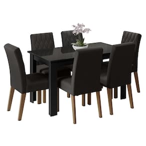A mesa em tom preto com tampo de vidro sobreposto confere elegância e personalidade ao ambiente. As cadeiras estofadas com tecido Oxford possui um detalhe na costura que garante não só um visual diferenciado mas também mais conforto.