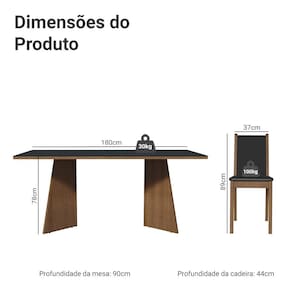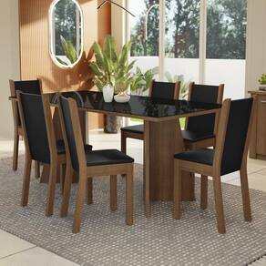 A mesa possui tampo retangular em MDP e vidro incolor sobreposto, acomodando muito bem seis pessoas. A base com design contemporâneo vai deixar sua cozinha ou sala de jantar ainda mais moderna e elegante.