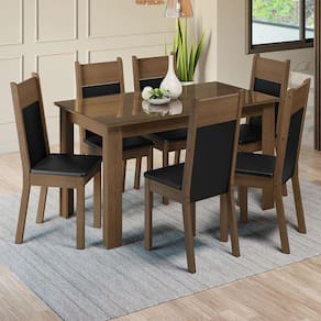 A mesa é retangular, com pés estruturais e acomoda perfeitamente até seis pessoas. O vidro incolor sobreposto ao tampo de madeira deixa o ambiente ainda mais elegante.