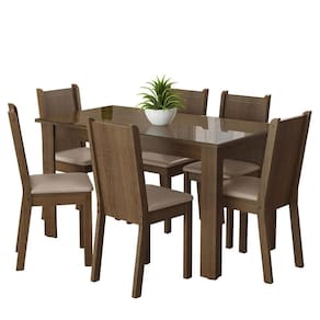 A mesa é retangular, com pés estruturais e acomoda perfeitamente até seis pessoas. O vidro incolor sobreposto ao tampo de madeira deixa o ambiente ainda mais elegante.