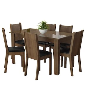 A mesa é retangular, com pés estruturais e acomoda perfeitamente até seis pessoas. O vidro incolor sobreposto ao tampo de madeira deixa o ambiente ainda mais elegante.