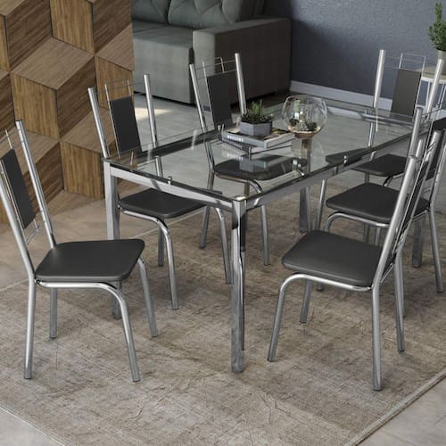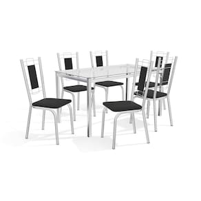 O conjunto de mesa da Kappesberg Crome, é composto pela mesa Reno com tampo de vidro retangular e 6 cadeiras Florença. Possui um design moderno que combina com todos os ambientes para as mais variadas ocasiões. Sua estrutura em aço, conta com acabamento cromado, características que oferecem mais durabilidade e resistência ao produto; Os assentos, que são estofados, também possuem qualidade excepcional. Com um conjunto de mesas cheio de qualidades como esse, você vai deixar sua casa ainda mais bonita. Medida da Mesa (A x L x P): 76,8cm x 150cm x 80cm Peso da Mesa: 38 kg Mesa suporta até: 60.0000 Acabamento da Cadeira/Banco: Cromado Acabamento da Mesa: Cromado Acompanha Manual de Instalação: Sim Almofada do assento: Fixa Ambiente: Sala de Jantar Ambiente Principal: Sala de Jantar Cadeira/Banco estofada: Sim Cadeira/Banco Estofada: Encosto e Assento Estofados Cadeira/Banco suporta até: 130.0000 Cadeira/Banco Suporta Até: 130 kg codigo_ean: 7895155216917 Complexidade da Montagem: Média: pode ser montado por mais de uma pessoa e/ou necessite de maior conhecimento para montagem Cor: Cromado/Preto Cor: Cromado/Preto Cor da Base: Cromado Cor do Tampo: Transparente Cor Secundária: Transparente De Canto (Canto Alemão): Não Design da Base: 4 Pés Enchimento do Assento: Espuma D-18 Enchimento do Encosto: Espuma D-18 Escala de Brilho: Brilhante Espessura do Tampo: 8 mm Espessura do Vidro: 8 mm Estrutura do Assento: MDP Formato do Tampo: Retangular Itens Inclusos: 1 Base de mesa, 1 Tampo, 6 Cadeiras, Manual de Montagem e Acessórios Linha ou Coleção: Crome Manual de Montagem e Instalação: https://product-hub-prd.madeiramadeira.com.br/1141040-m001-cr.pdf/documents/1141040-m001-cr.pdf Manutenção: Limpeza diária somente com pano seco (flanela) ou pano branco e macio, pois o acúmulo de sujeira estimula o aparecimento de ferrugem. Evitar limpar com água, pois pode ocorrer o acúmulo de líquido em regiões específicas da peça. Não utilizar produtos de limpeza que possuem cloro em sua formação. Encerar no mínimo uma vez por mês com cera automotiva. Em zona litorânea encerrar pelo menos 1 vez por semana. A maresia e a umidade são altamente prejudiciais ao revestimento. Não utilizar qualquer tipo abrasivo de limpeza. Não deixar as estruturas expostas ao ambiente externo como sacadas, pátios. Etc. Batidas na estrutura podem ocasionar riscos e desplacamento da camada de pintura. Material da Base da Mesa: Aço Material da Estrutura da Cadeira: Ferro Material do Tampo: Vidro Material Principal das Cadeiras/Bancos: Aço Medida da Base (A x L x P): 76cm x 148cm x 78cm Medida da Cadeira/Banco (A x L x P): 99cm x 42cm x 47,5cm Medida do Tampo (L x C x E): 80cm x 150cm x 0,8cm Mesa Extensível: Não Necessita Montagem: Sim Origem do Produto: Nacional Peso da Cadeira/Banco: 6 kg Possui Apoio Para os Pés: Não Quantidade de Cadeiras: 6 Quantidade de Lugares: 06 Recomendações de Uso, Manutenção e Limpeza: Limpeza diária somente com pano seco (flanela) ou pano branco e macio, pois o acúmulo de sujeira estimula o aparecimento de ferrugem. Evitar limpar com água, pois pode ocorrer o acúmulo de líquido em regiões específicas da peça. Não utilizar produtos de limpeza que possuem cloro em sua formação. Encerar no mínimo uma vez por mês com cera automotiva. Em zona litorânea encerrar pelo menos 1 vez por semana. A maresia e a umidade são altamente prejudiciais ao revestimento. Não utilizar qualquer tipo abrasivo de limpeza. Não deixar as estruturas expostas ao ambiente externo como sacadas, pátios. Etc. Batidas na estrutura podem ocasionar riscos e desplacamento da camada de pintura. Revestimento da Cadeira/Banco: Courino Sistema de Montagem: Parafusos Philips e allen Tipo: Conjunto Tipo de Encosto: Fixo Vidro Temperado: Não Ean: 7895155216917