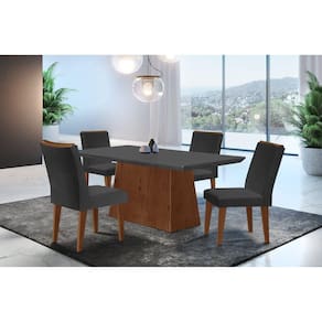 Sala de Jantar Alana/Dublin possui um design imponente e clássico, que ganha mais destaque pelo seu tampo amplo com detalhe chanfrado, dando um ar de sofisticação à peça. Suas cadeiras são estofadas com espumas de alta qualidade, além de serem revestidas em tecido que oferece maior suavidade, maciez e beleza. É a composição perfeita para confraternizar com pessoas especiais. Sala de Jantar Alana/Dublin, produzida em material 100% MDF e tampo em MDF chanfrado. Em sua confecção é utilizada a pintura UV, que preserva a cor do produto por mais tempo. As cadeiras são revestidas com tecidos e estofadas com espumas de alta qualidade. Medida da Mesa (A x L x P): 80 x 120 x 80 cm Peso da Mesa: 32,1 kg Acabamento da Cadeira/Banco: Pintura UV Acabamento da Mesa: Pintura UV Almofada do assento: Fixa Altura do Conjunto: 99.5 Ambiente Principal: Sala de Jantar Cadeira/Banco estofada: Encosto e Assento Estofados Cadeira/Banco Estofada: Encosto e Assento Estofados Cadeira/Banco suporta até: 100.0000 codigo_ean: 7909903258293 Complexidade da Montagem: Média: pode ser montado por mais de uma pessoa e/ou necessite de maior conhecimento para montagem Cor: Grafite/Imbuia Cor da Base: Marrom Cor do Tampo: Cinza Cor Flex: Sim, na base. De Canto (Canto Alemão): Não Enchimento do Assento: Espuma D-16 Enchimento do Encosto: Espuma D-14 Espessura do Tampo: 15 mm Informações Complementares: Conjunto produzido em material 100% MDF, acabamento em pintura UV, e cadeiras estofadas com espumas e tecidos de alta qualidade. Itens Inclusos: 1 Mesa com 4 Cadeiras e Manual de Montagem Linha ou Coleção: Alana/Dublin Manual de Montagem e Instalação: https://product-hub-prd.madeiramadeira.com.br/22731-22732.pdf/documents/22731-22732.pdf Material da Estrutura da Cadeira: MDF/Madeira Maciça Material do Tampo: MDF Material Principal: MDF Medida da Base (A x L x P): 78 x 78,5 x 35,5 cm Medida da Cadeira/Banco (A x L x P): 99,5 x 42 x 61 cm Medida do Tampo (L x C x E): 80 x 120 x 6 cm Necessita Montagem: Sim Origem do Produto: Nacional Peso da Cadeira/Banco: 8,025 kg Possui Apoio Para os Pés: Não Possui Suporte Giratório: Não Possui Vidro: Não Quantidade de Cadeiras: 4 Quantidade de Lugares: 04 Revestimento da Cadeira/Banco: Veludo Vidro Temperado: Não