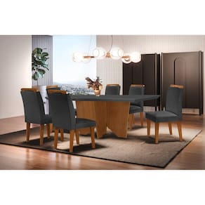 Sala de Jantar Nancy/Esmeralda é um conjunto elegante e sofisticado. Com sua base em formato robusto e um detalhe encantador que deixará seu ambiente ainda mais aconchegante e moderno. Suas cadeiras são estofadas com espumas de alta qualidade, além de serem revestidas em tecido que oferece maior suavidade, maciez e beleza. Seu encosto possui alça em MDF, trazendo modernidade e elegância para a sua casa. Perfeita para receber aquele grupo de amigos em casa e proporcionar momentos especiais. Sala de Jantar Nancy/Esmeralda, produzida em material 100% MDF e tampo em MDF chanfrado. Em sua confecção é utilizada a pintura UV, que preservam a cor por mais tempo. As cadeiras são revestidas com tecidos e estofadas com espumas de alta qualidade. Medida da Mesa (A x L x P): 80 x 180 x 90 cm Peso da Mesa: 49,35 kg Mesa suporta até: 30.0000 Acabamento da Cadeira/Banco: Pintura UV Acabamento da Mesa: Pintura UV Almofada do assento: Fixa Altura do Conjunto: 102.5 Ambiente Principal: Sala de Jantar Cadeira/Banco estofada: Encosto e Assento Estofados Cadeira/Banco Estofada: Encosto e Assento Estofados Cadeira/Banco suporta até: 100.0000 codigo_ean: 7909903258330 Complexidade da Montagem: Média: pode ser montado por mais de uma pessoa e/ou necessite de maior conhecimento para montagem Cor: Grafite/Imbuia Cor do Produto: Grafite/Imbuia Cor Flex: Não De Canto (Canto Alemão): Não Design da Base: Cruz Enchimento do Assento: Espuma D-16 Enchimento do Encosto: Espuma D-14 Escala de Brilho: Semi-Fosco Espessura do Tampo: 15 mm Informações Complementares: Conjunto produzido em material 100% MDF, acabamento em pintura UV, e cadeiras estofadas com espumas e tecidos de alta qualidade. Itens Inclusos: 1 Mesa com 6 Cadeiras e Manual de Montagem Linha ou Coleção: Nancy/Esmeralda Manual de Montagem e Instalação: https://product-hub-prd.madeiramadeira.com.br/27980.pdf/documents/27980.pdf Material da Base da Mesa: MDF Material do Tampo: MDF Medida da Base (A x L x P): 78,5 x 100 x 50 cm Medida da Cadeira/Banco (A x L x P): 102,5 x 42 x 56 cm Medida do Tampo (L x C x E): 90 x 180 x 6 cm Mesa Extensível: Não Montagem Flex: Não Necessita Montagem: Sim Origem do Produto: Nacional Peso da Cadeira/Banco: 8,425 kg Possui Apoio para Braços: Não Possui Apoio Para os Pés: Não Possui Suporte Giratório: Não Quantidade de Cadeiras: 6 Quantidade de Lugares: 06 Recomendações de Uso, Manutenção e Limpeza: Limpar com flanela ou pano macio seco, não utilizar produtos abrasivos, desengordurantes, álcool ou solvente. Não expor o produto diretamente à luz solar e à umidade. Revestimento da Cadeira/Banco: Linho Sistema de Montagem: Parafusos, Conectores e Sapatas. Vidro Temperado: Não