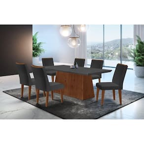 Sala de Jantar Alana/Dublin possui um design imponente e clássico, que ganha mais destaque pelo seu tampo amplo com detalhe chanfrado, dando um ar de sofisticação à peça. Suas cadeiras são estofadas com espumas de alta qualidade, além de serem revestidas em tecido que oferece maior suavidade, maciez e beleza. É a composição perfeita para confraternizar com pessoas especiais. Sala de Jantar Alana/Dublin, produzida em material 100% MDF e tampo em MDF chanfrado. Em sua confecção é utilizada a pintura UV, que preserva a cor do produto por mais tempo. As cadeiras são revestidas com tecidos e estofadas com espumas de alta qualidade. Medida da Mesa (A x L x P): 80 x 180 x 90 cm Peso da Mesa: 49,3 kg Acabamento da Cadeira/Banco: Pintura UV Acabamento da Mesa: Pintura UV Almofada do assento: Fixa Altura do Conjunto: 99.5 Ambiente Principal: Sala de Jantar Cadeira/Banco estofada: Encosto e Assento Estofados Cadeira/Banco Estofada: Encosto e Assento Estofados Cadeira/Banco suporta até: 100.0000 codigo_ean: 7909903258323 Complexidade da Montagem: Média: pode ser montado por mais de uma pessoa e/ou necessite de maior conhecimento para montagem Cor: Grafite/Imbuia Cor da Base: Marrom Cor do Tampo: Cinza Cor Flex: Sim, na base. De Canto (Canto Alemão): Não Enchimento do Assento: Espuma D-16 Enchimento do Encosto: Espuma D-14 Espessura do Tampo: 15 mm Informações Complementares: Conjunto produzido em material 100% MDF, acabamento em pintura UV, e cadeiras estofadas com espumas e tecidos de alta qualidade. Itens Inclusos: 1 Mesa com 6 Cadeiras e Manual de Montagem Linha ou Coleção: Alana/Dublin Manual de Montagem e Instalação: https://product-hub-prd.madeiramadeira.com.br/22731-22732.pdf/documents/22731-22732.pdf Material da Estrutura da Cadeira: MDF/Madeira Maciça Material do Tampo: MDF Material Principal: MDF Medida da Base (A x L x P): 78 x 113,5 x 44,5 cm Medida da Cadeira/Banco (A x L x P): 99,5 x 42 x 61 cm Medida do Tampo (L x C x E): 90 x 180 x 6 cm Necessita Montagem: Sim Origem do Produto: Nacional Peso da Cadeira/Banco: 8,025 kg Possui Apoio Para os Pés: Não Possui Suporte Giratório: Não Possui Vidro: Não Quantidade de Cadeiras: 6 Quantidade de Lugares: 06 Revestimento da Cadeira/Banco: Veludo Vidro Temperado: Não
