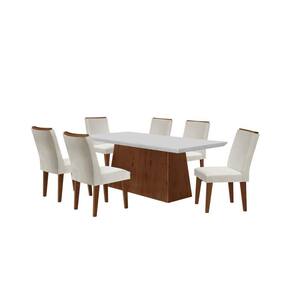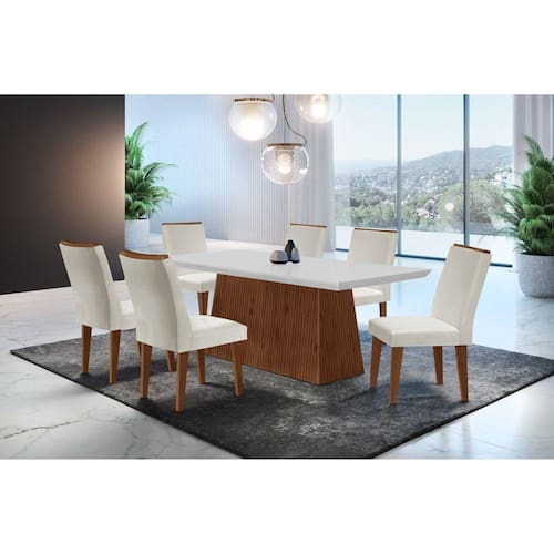 Sala de Jantar Alana/Dublin possui um design imponente e clássico, que ganha mais destaque pelo seu tampo amplo com detalhe chanfrado, dando um ar de sofisticação à peça. Suas cadeiras são estofadas com espumas de alta qualidade, além de serem revestidas em tecido que oferece maior suavidade, maciez e beleza. É a composição perfeita para confraternizar com pessoas especiais. Sala de Jantar Alana/Dublin, produzida em material 100% MDF e tampo em MDF chanfrado. Em sua confecção é utilizada a pintura UV, que preserva a cor do produto por mais tempo. As cadeiras são revestidas com tecidos e estofadas com espumas de alta qualidade. Medida da Mesa (A x L x P): 80 x 180 x 90 cm Peso da Mesa: 49,3 kg Acabamento da Cadeira/Banco: Pintura UV Acabamento da Mesa: Pintura UV Almofada do assento: Fixa Altura do Conjunto: 99.5 Ambiente Principal: Sala de Jantar Cadeira/Banco estofada: Encosto e Assento Estofados Cadeira/Banco Estofada: Encosto e Assento Estofados Cadeira/Banco suporta até: 100.0000 codigo_ean: 7909903257081 Complexidade da Montagem: Média: pode ser montado por mais de uma pessoa e/ou necessite de maior conhecimento para montagem Cor: Off White/Imbuia Cor da Base: Marrom Cor do Tampo: Bege Cor Flex: Sim, na base. De Canto (Canto Alemão): Não Enchimento do Assento: Espuma D-16 Enchimento do Encosto: Espuma D-14 Espessura do Tampo: 15 mm Informações Complementares: Conjunto produzido em material 100% MDF, acabamento em pintura UV, e cadeiras estofadas com espumas e tecidos de alta qualidade. Itens Inclusos: 1 Mesa com 6 Cadeiras e Manual de Montagem Linha ou Coleção: Alana/Dublin Manual de Montagem e Instalação: https://product-hub-prd.madeiramadeira.com.br/22731-22732.pdf/documents/22731-22732.pdf Material da Estrutura da Cadeira: MDF/Madeira Maciça Material do Tampo: MDF Material Principal: MDF Medida da Base (A x L x P): 78 x 113,5 x 44,5 cm Medida da Cadeira/Banco (A x L x P): 99,5 x 42 x 61 cm Medida do Tampo (L x C x E): 90 x 180 x 6 cm Necessita Montagem: Sim Origem do Produto: Nacional Peso da Cadeira/Banco: 8,025 kg Possui Apoio Para os Pés: Não Possui Suporte Giratório: Não Possui Vidro: Não Quantidade de Cadeiras: 6 Quantidade de Lugares: 06 Revestimento da Cadeira/Banco: Veludo Vidro Temperado: Não