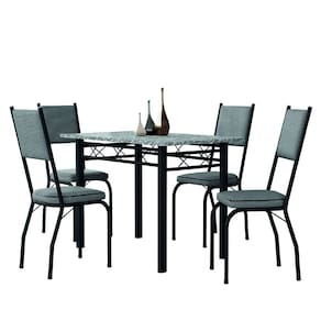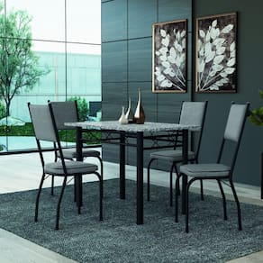O Conjunto Sala de Jantar Mesa Diana com 4 lugares foi desenvolvido para trazer ainda mais beleza e conforto para o seu lar. Possui tampo retangular em granito resistente a altas temperaturas, e as cadeiras são revestidas em tecido material sintético de fácil limpeza. Ainda conta com base da mesa e cadeiras de aço, garantindo resistência e durabilidade.