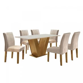 Se você pretende completar a sua casa com bom gosto e charme, então veja que mimo este lindo Conjunto de Mesa e Cadeiras, Não é uma excelente forma de começar? Super charmoso, ele é perfeito para que você dê um visual fancy e moderno para o seu lar, Medida da Mesa (A x L x P): 79,5cm x 160cm x 80cm Peso da Mesa: 30 Mesa suporta até: 40 Acabamento da Cadeira/Banco: Pintura UV Acabamento da Mesa: Pintura UV Almofada do assento: Fixa Altura do Conjunto: Ambiente Principal: Sala de Jantar Apoio para Braços Estofado: Não Cadeira/Banco estofada: Encosto e Assento Estofados Cadeira/Banco Estofada: Encosto e Assento Estofados Cadeira/Banco suporta até: 120 Cadeira/Banco Suporta Até: 120 kg Complexidade da Montagem: Alta: deve ser montado por um montador especializado Cor: Ypê/Off White Cor da Base: Cor do Produto: Ypê/Off White Cor do Tampo: Cor Flex: Cor Predominante: Marrom Cor Secundária: Branco De Canto (Canto Alemão): Não Design da Base: Enchimento do Assento: Espuma D-23 Enchimento do Encosto: Espuma D-20 Escala de Brilho: Fosco Espessura do Tampo: 15 Espessura do Vidro: Estrutura do Assento: MDF Estrutura do Encosto: MDF Formato do Tampo: Retangular Informações Complementares: Itens Inclusos: 1 Mesa, 6 Cadeiras e Manual de Montagem, Linha ou Coleção: Espanha Manual de Especificação Técnica: https://cdn2,madeiramadeira,com,br/atributo/cel-m-veis/812736-534249-conjunto-espanha-6-cadeiras-mdf,pdf Manual de Montagem e Instalação: Material da Base da Mesa: MDF Material da Estrutura da Cadeira: MDF Material do Tampo: MDF Material Principal das Cadeiras/Bancos: MDF Medida da Base (A x L x P): 77,3cm x 89cm x 40cm Medida da Cadeira/Banco (A x L x P): 95cm x 44cm x 56cm Medida do Canto Alemão (A x L x P): Medida do Suporte Giratório (L x C x E): Medida do Tampo (L x C x E): 160cm x 80cm x 1,5cm Mesa Extensível: Não Montagem Flex: Necessita Montagem: Sim Origem do Produto: Nacional Peso da Cadeira/Banco: 7,5 Possui Apoio para Braços: Não Possui Apoio Para os Pés: Não Possui Suporte Giratório: Não Quantidade de Lugares: 06 Recomendações de Uso, Manutenção e Limpeza: Limpeza com pano macio e levemente umedecido, Não utilizar solventes a base e de inflamáveis, Não utilizar produtos abrasivos, Revestimento da Cadeira/Banco: Suede Sistema de Montagem: Parafusos e Minifix, Tamanho: Tipo de Madeira Maciça da Base da Mesa: Tipo de Madeira Maciça do Tampo: undefined: Outro Vidro Temperado: