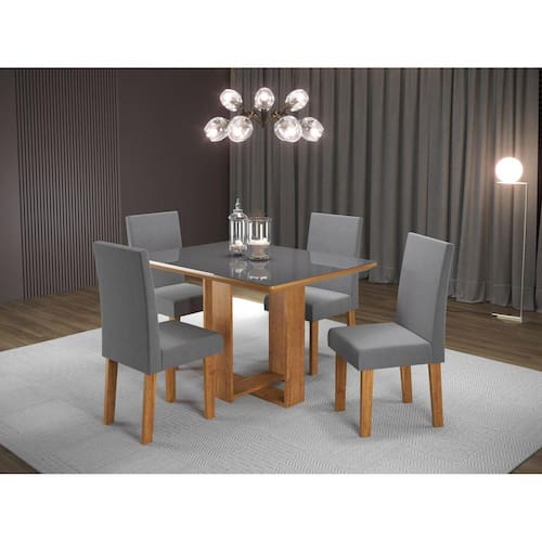 Mesas são indispensáveis para o funcionamento da casa e é no cômodo de confraternização que elas ganham protagonismo. Composto por peças de muito charme, o Conjunto Ville e Venus torna o uso desse móvel importante com 4 cadeiras para garantir uma usabilidade plena para o seu dia a dia Medida da Mesa (A x L x P): 79 x 120 x 90cm Peso da Mesa: 42,8 kg Mesa suporta até: 50.0000 Acabamento da Cadeira/Banco: Pintura UV Acabamento da Mesa: Pintura UV Ambiente Principal: Sala de Estar Cadeira/Banco Estofada: Encosto e Assento Estofados Cadeira/Banco estofada: Encosto e Assento Estofados Cadeira/Banco suporta até: 90.0000 codigo_ean: 7908308788220 Complexidade da Montagem: Média: pode ser montado por mais de uma pessoa e/ou necessite de maior conhecimento para montagem Cor: Mel/Cinza/Grafite Cor da Base: Marrom Cor do Tampo: Cinza Cor Secundária: Cinza De Canto (Canto Alemão): Não Enchimento do Assento: Espuma D-20 Enchimento do Encosto: Espuma D-12 Espessura do Tampo: 40 mm Estrutura do Assento: MDP/Espuma Estrutura do Encosto: MDP/Espuma Formato do Tampo: Retangular Manual de Montagem e Instalação: https://product-hub-prd.madeiramadeira.com.br/840577/documents/1c2b179d-c374-499d-a737-9503ae554f0dmesavicenzacomcadeiravenus.pdf Manutenção: Limpar com pano levemente umedecido com água Material da Base da Mesa: MDP Material da Estrutura da Cadeira: MDF/MDP Material do Tampo: Vidro/MDF Medida da Cadeira/Banco (A x L x P): 98,5cm x 42cm x 48cm Medida do Tampo (L x C x E): 120cm x 90cm x 4cm Mesa Extensível: Não Necessita Montagem: Sim Origem do Produto: Nacional Peso da Cadeira/Banco: 7,1 kg Quantidade de Cadeiras: 4 Quantidade de Lugares: 04 Recomendações de Uso, Manutenção e Limpeza: Limpar com pano levemente umedecido com água Revestimento da Cadeira/Banco: Veludo Vidro Temperado: Sim Ean: 7908308788220