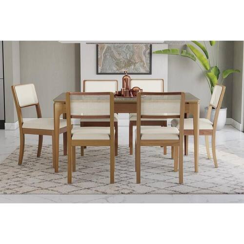 Sala de Jantar Completa Mira Premium Madeira Maciça c/ Tampo Madeirado c/ Vidro 160x90cm e 6 Cadeiras Lola Carvalho/Freijo Bronze - Linho Bege Argila - Kappesberg