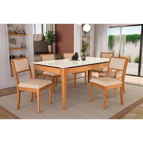 Sala de Jantar Completa Mira Premium Madeira Maciça c/ Tampo Madeirado c/ Vidro 200x100cm e 6 Cadeiras Alice Carvalho/Off White - Linho Bege Argila - Kappesberg