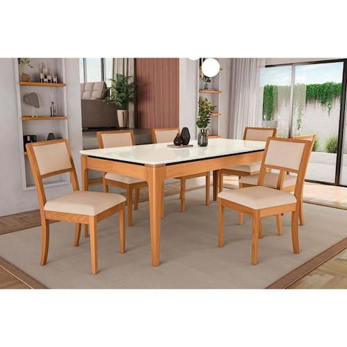 Abaixo segue os produtos do KIT: Sala de Jantar Completa Mira Premium Madeira Maciça c/ Tampo Madeirado c/ Vidro 200x100cm e 6 Cadeiras Alice Carvalho/Off White - Linho Bege Argila - Kappesberg