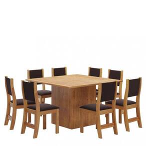 Conjunto com estrutura em MDF/MDP Tampo com espessura 40mm e vidro 4mm Suporta até 50 kg distribuídos Acabamento sem-brilho Pintura UV 8 cadeiras Assento em MDP e espuma D20 Encosto espuma D12 Cada cadeira suporta até 80 kg Revestimento com tecido veludo