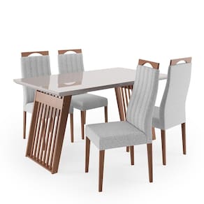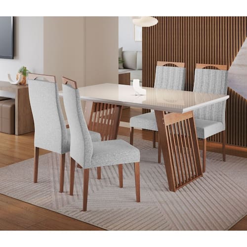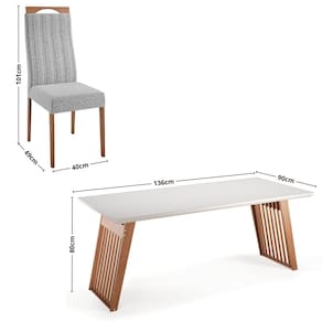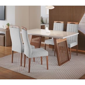 O Conjunto Sala de Jantar Moscou com 4 Cadeiras Grecia Madetal combina elegância e resistência para compor ambientes aconchegantes e funcionais. As cadeiras são fabricadas com estrutura em madeira de eucalipto, acabamento em verniz, assento e encosto com espuma revestidos em tecido linho, suportando até 120kg cada. A mesa, também em madeira de eucalipto, possui pés robustos, acabamento envernizado e tampo com vidro fixado de 4mm, suportando até 30kg. Ideal para ambientes compactos, oferece conforto e estilo para sua sala de jantar.