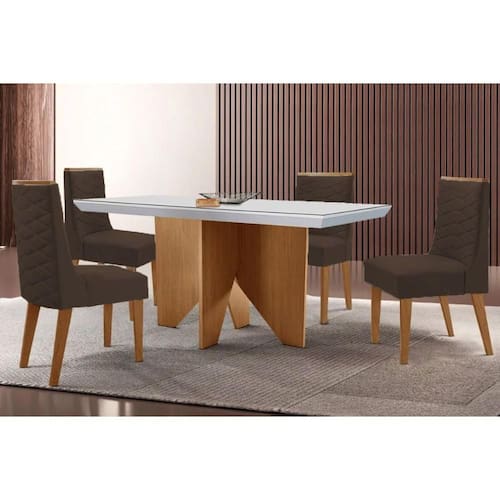 Sala de Jantar Completa Nevada c/ Tampo Madeirado c/ Vidro Canto Curvo 120x80cm e 4 Cadeiras Dafne Madeira Maciça Naturale/Off White - Capuccino/Suede Marrom - Rufato Abaixo segue os produtos do KIT: Sala de Jantar Completa Nevada c/ Tampo Madeirado c/ Vidro Canto Curvo 120x80cm e 4 Cadeiras Dafne Madeira Maciça Naturale/Off White - Capuccino/Suede Marrom - Rufato